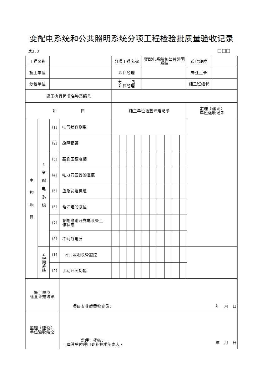 表格名称:表J.3 变配电系统和公共照明系统分项工程检验批质量验收记录