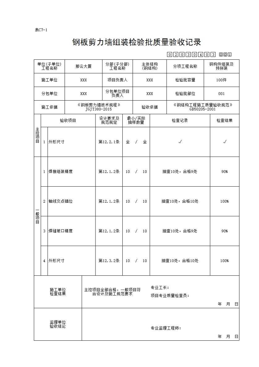 表格名称:02030403_钢板剪力墙组装检验批质量验收记录