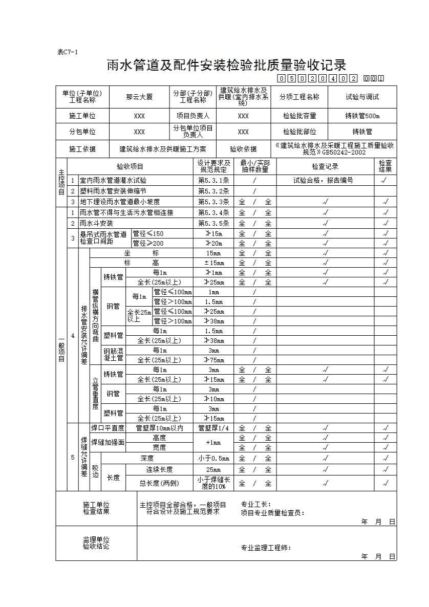05020402_雨水管道及配件安装检验批质量验收记录