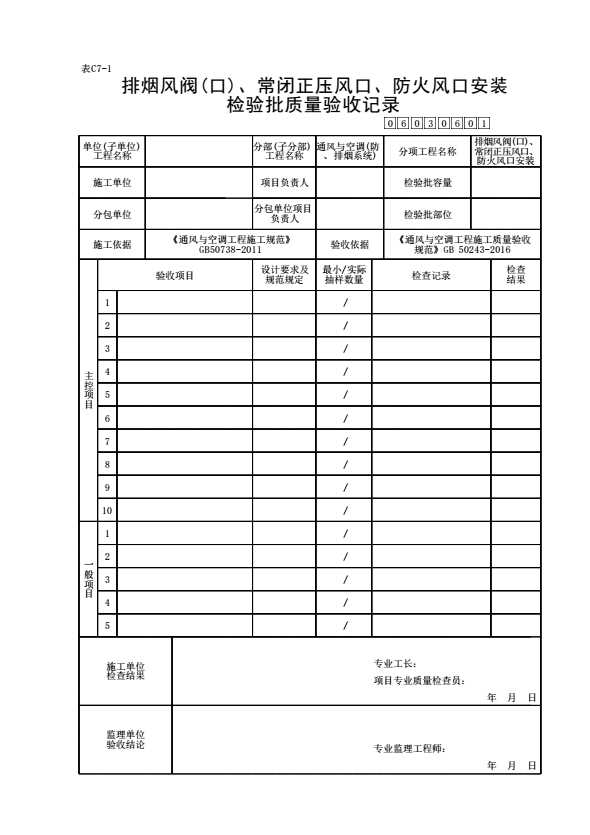 表格名称:06030601_排烟风阀(口)、常闭正压风口、防火风口安装检验批质量验收记录