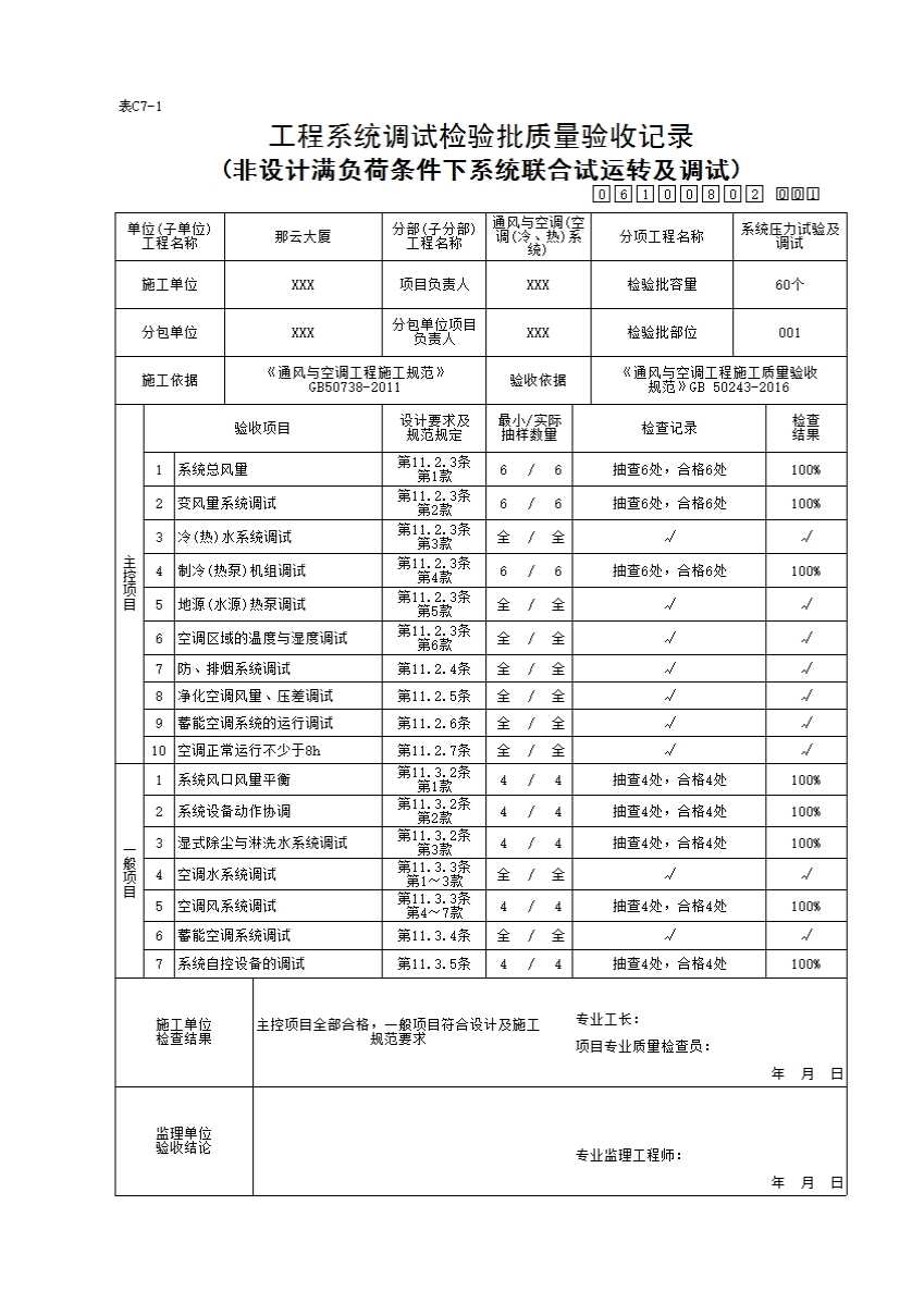 06100802_工程系统调试检验批质量验收记录(非设计满负荷条件下系统联合试运转及调试)