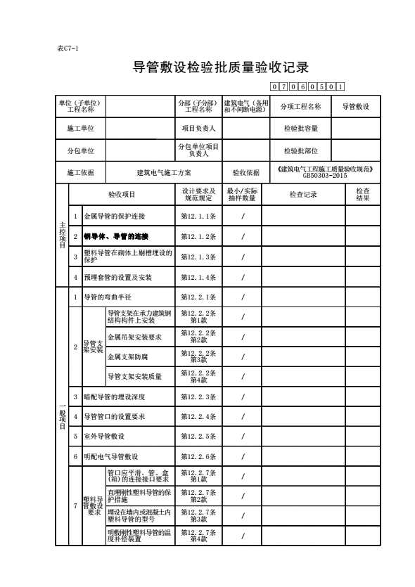 检查数量:第1款、第2款全数检查,第3款、第4款按每个检验批的导管总数抽查10%,且各不得少于1根(处),并应覆盖不同的敷设场所及不同规格的导管。