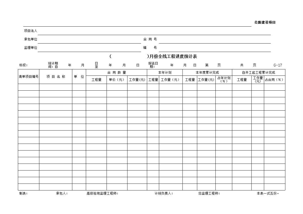 G-17 ( )月份全线工程进度统计表