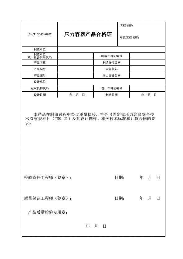 表格名称:SH/T 3543-G702 压力容器产品合格证