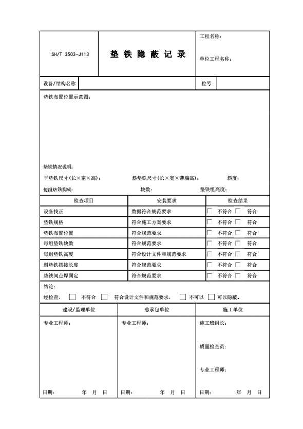 SH/T 3503-J113 垫铁隐蔽记录