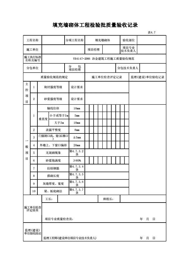 表格名称:表4.7 填充墙砌体工程检验批质量验收记录