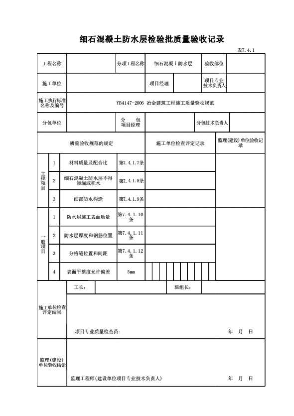 表格名称:表7.4.1 细石混凝土防水层检验批质量验收记录