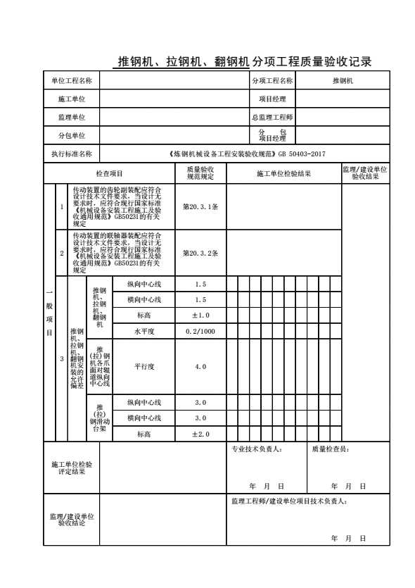 表格名称:推钢机、拉钢机、翻钢机分项工程质量验收记录
