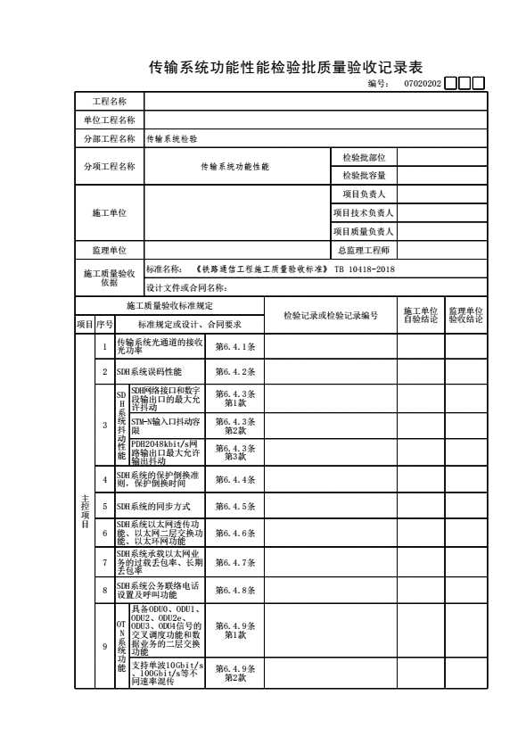 表格名称:07020202 传输系统功能性能检验批质量验收记录表