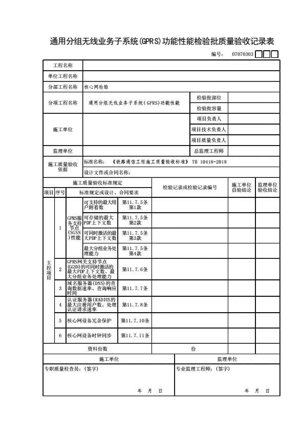 07070303 通用分组无线业务子系统(GPRS)功能性能检验批质量验收记录表