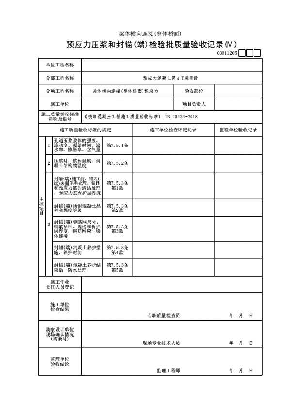 表格名称:03011205 预应力压浆和封锚(端)检验批质量验收记录(Ⅳ)