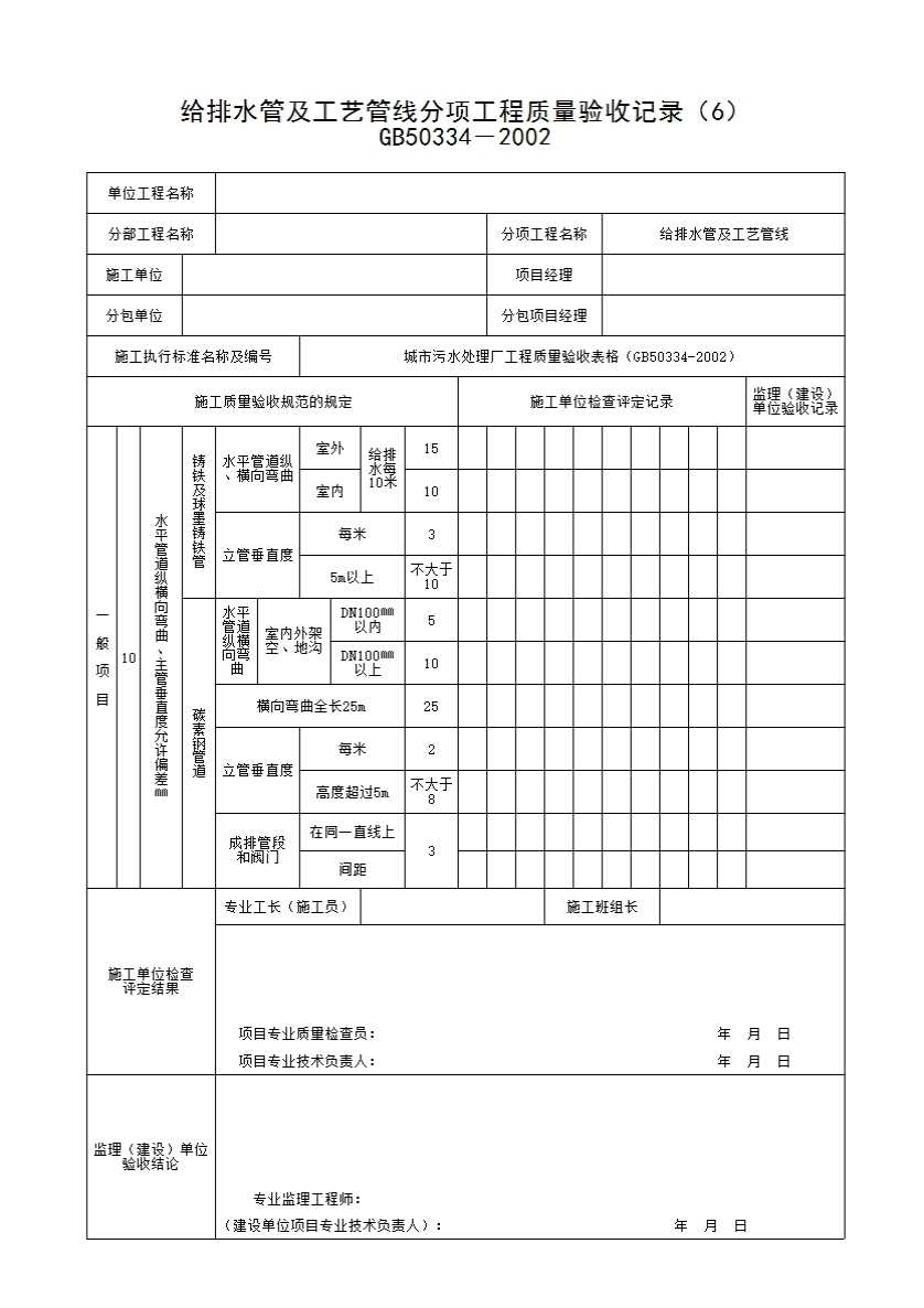 表格名称:23 给排水管及工艺管线分项工程质量验收记录