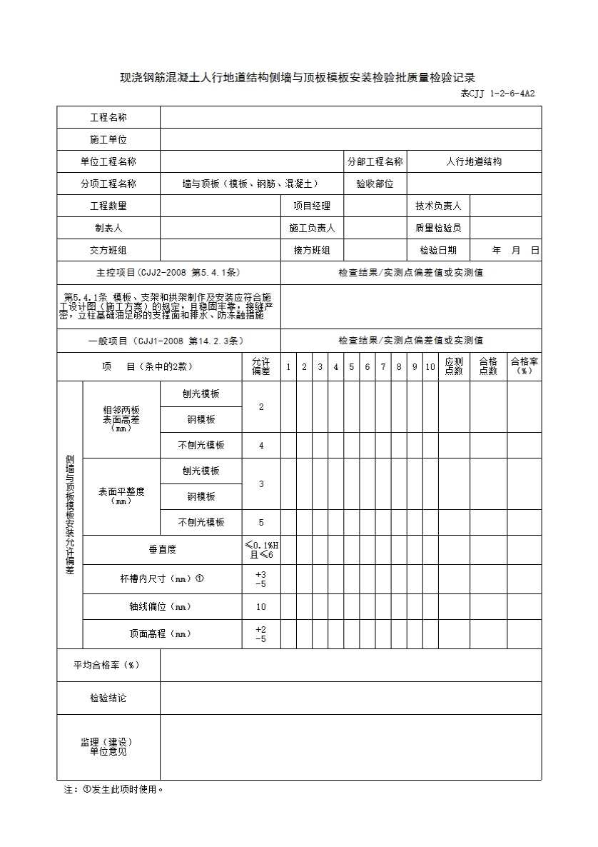 表格名称:表CJJ 1-2-6-4A2 现浇钢筋混凝土人行地道结构侧墙与顶板模板安装检验批质量检验记录