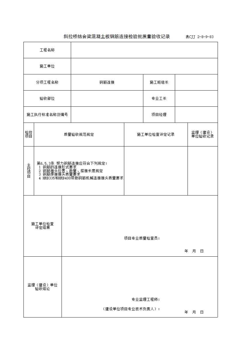 表格名称:表CJJ 2-8-9-83 斜拉桥结合梁混凝土板钢筋连接检验批质量验收记录