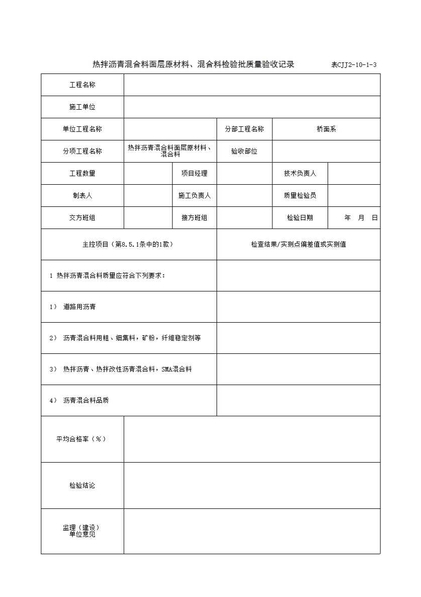 表CJJ2-10-1-3 热拌沥青混合料面层原材料、混合料检验批质量验收记录