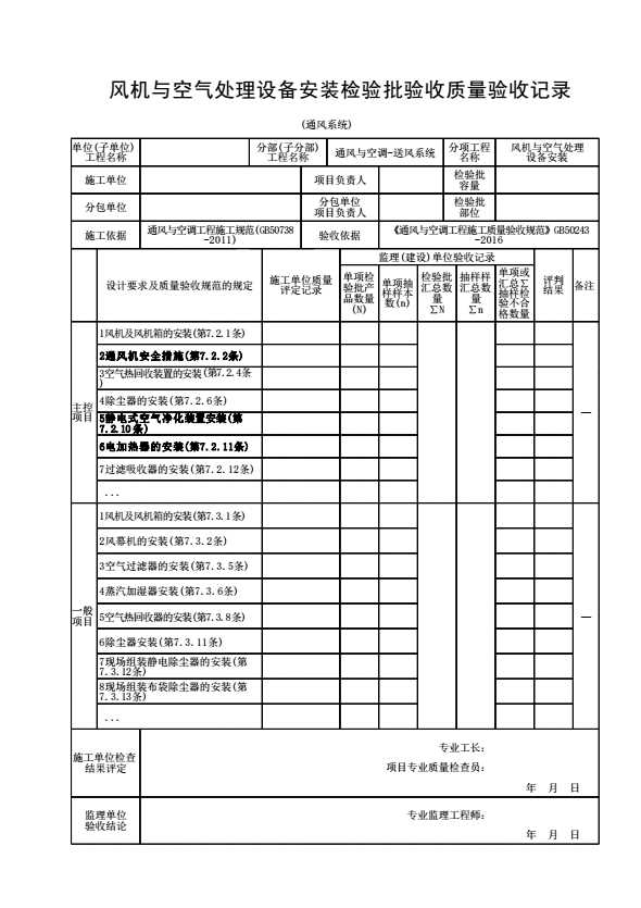 风机与空气处理设备安装检验批验收质量验收记录(通风系统)