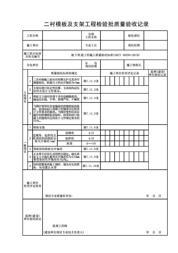 表格名称:二衬模板及支架工程检验批质量验收记录