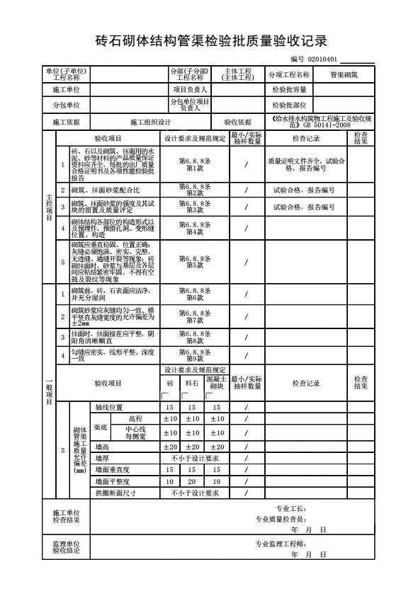 表格名称:02010401_砖石砌体结构管渠检验批质量验收记录