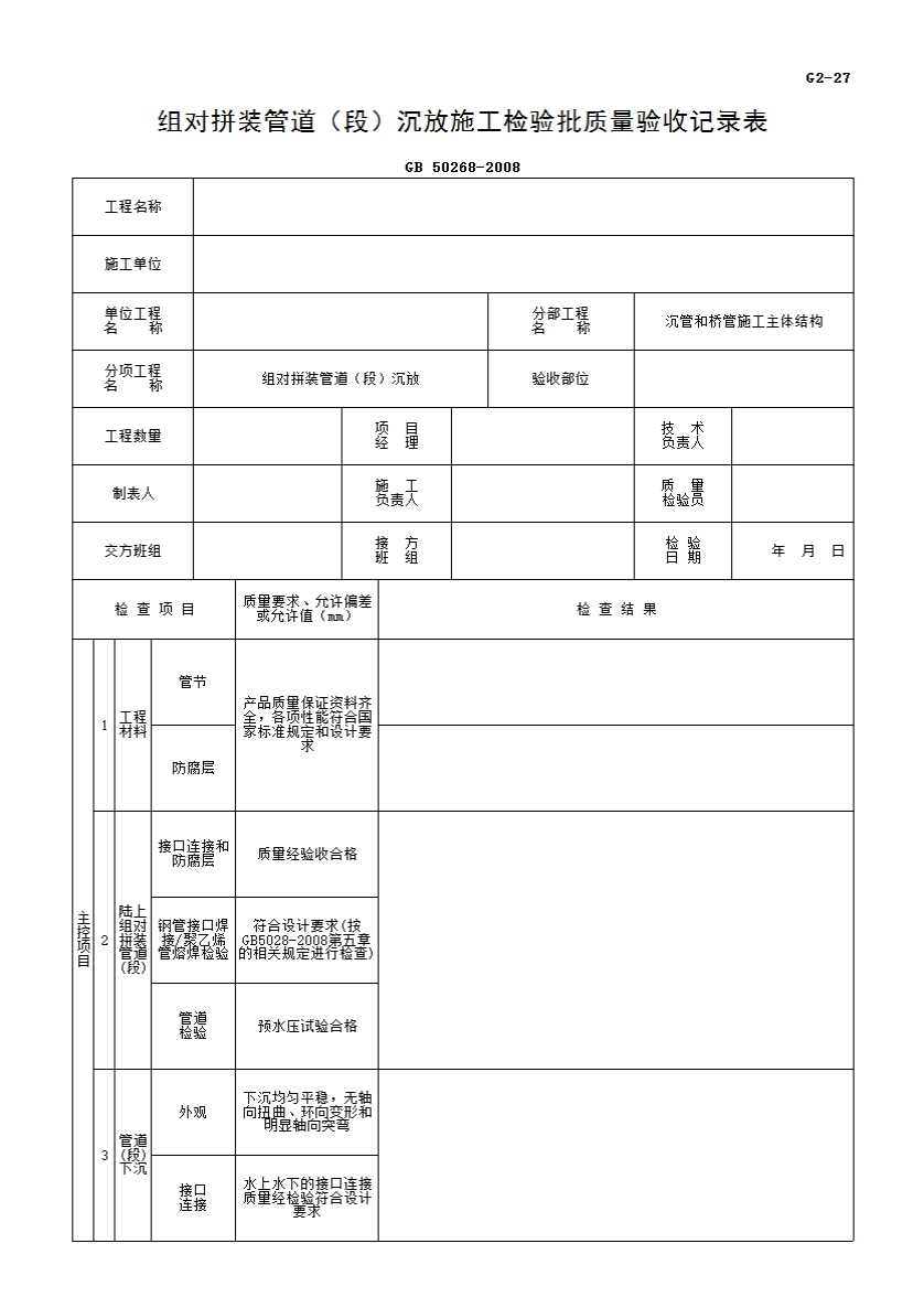 表格名称:组对拼装管道(段)沉放施工检验批质量验收记录表