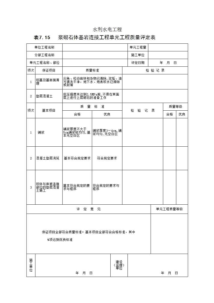 表格名称:表7.15 浆砌石体基岩连接工程单元工程质量评定表