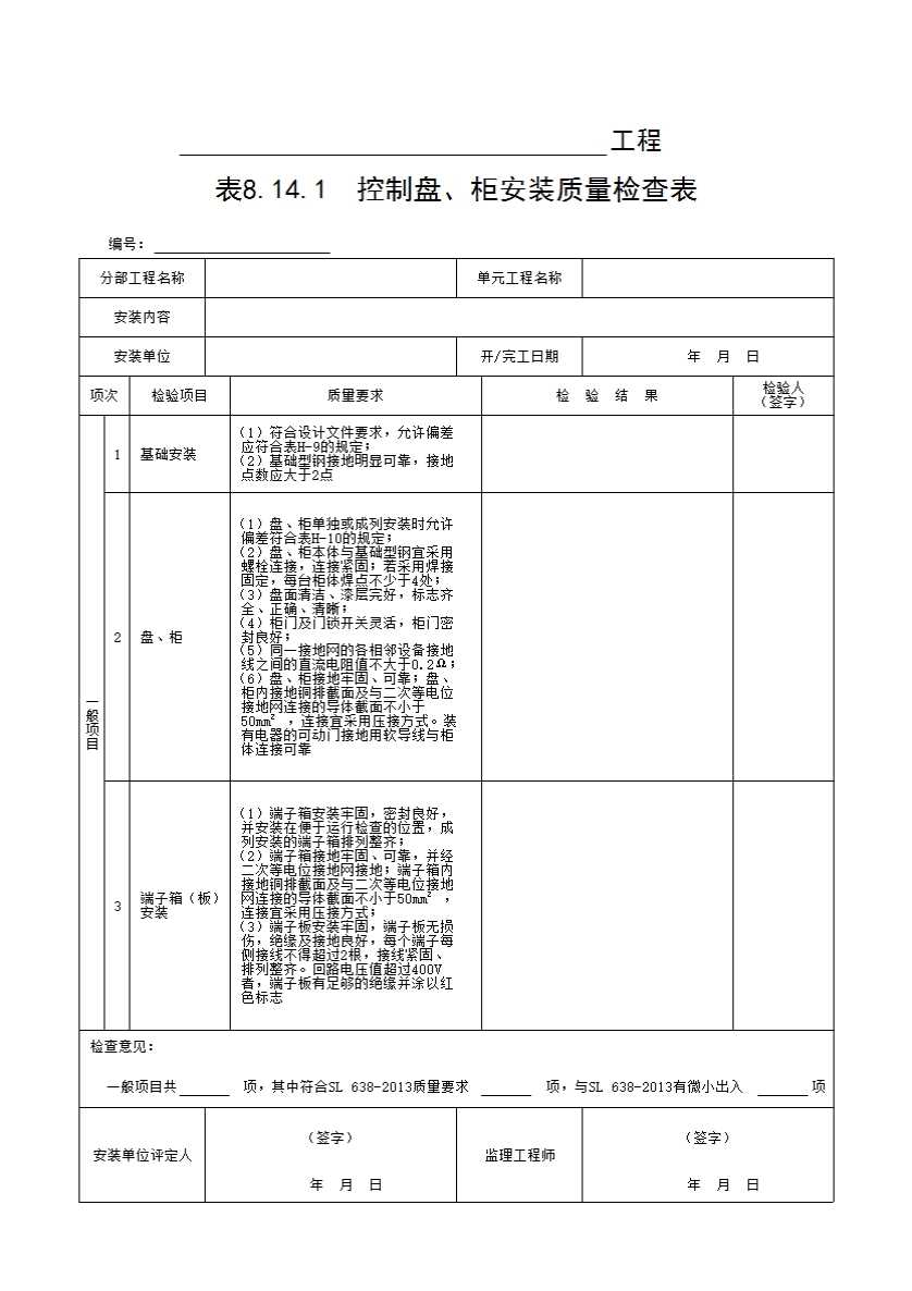 表格名称:表8.14.1 控制盘、柜安装质量检查表