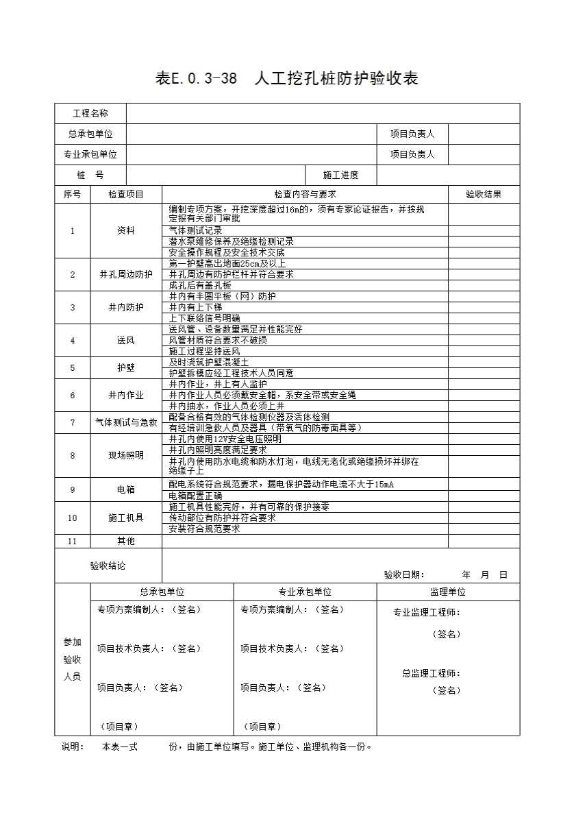 表格名称:表E.0.3-38 人工挖孔桩防护验收表