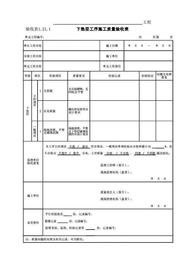 表格名称:表1.21.1 下垫层工序施工质量验收表