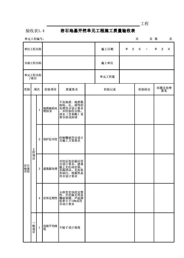 表格名称:表1.4 岩石地基开挖单元工程施工质量验收表