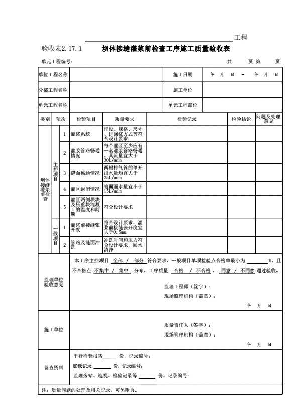 表格名称:表2.17.1 坝体接缝灌浆前检查工序施工质量验收表