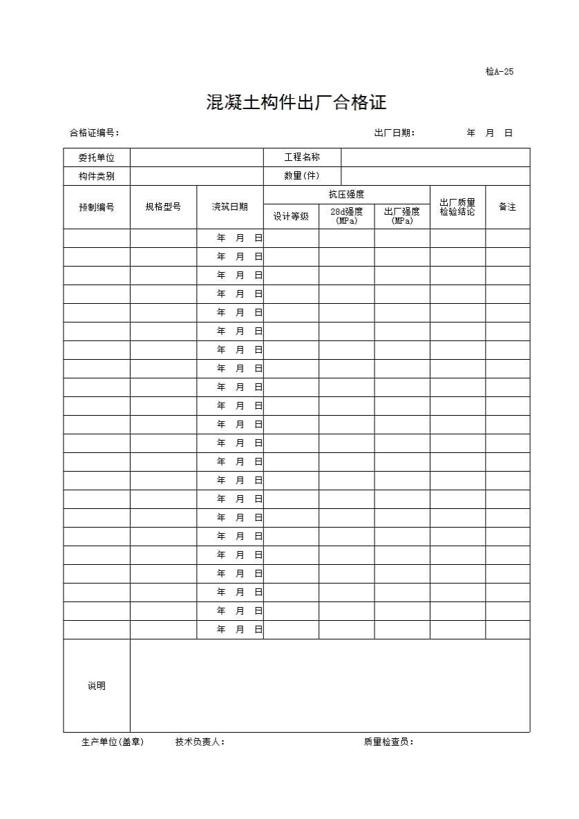 表格名称:25、(评A-25)混凝土构件出厂合格证