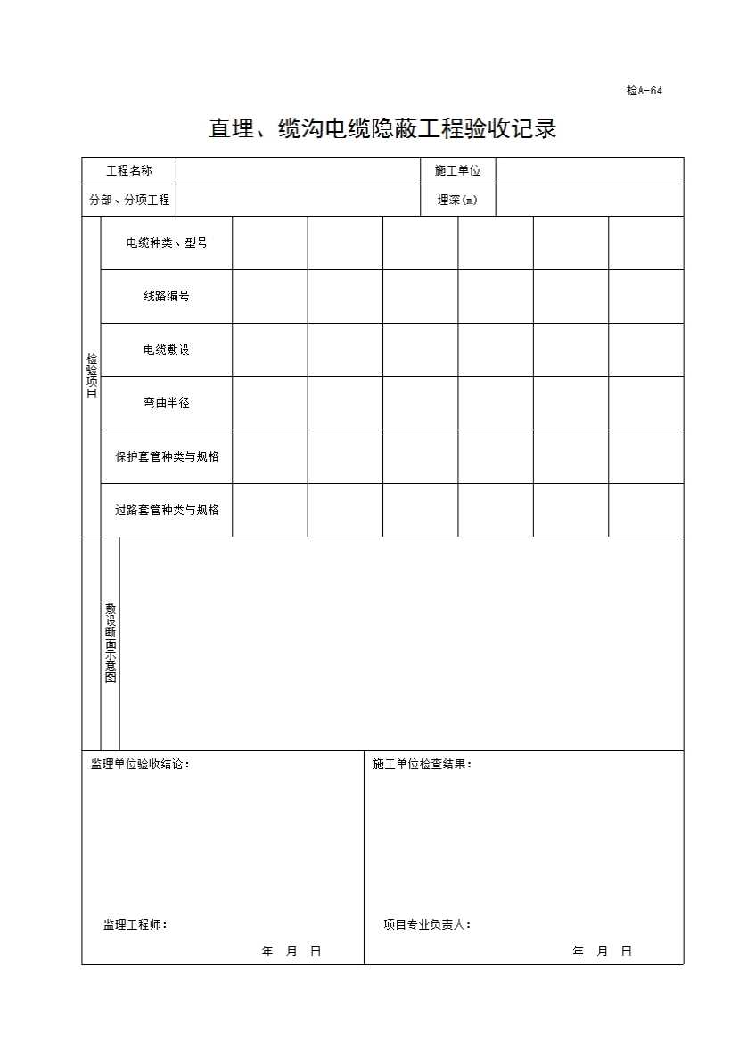 表格名称:64、(评A-64)直埋、缆沟电缆隐蔽工程验收记录