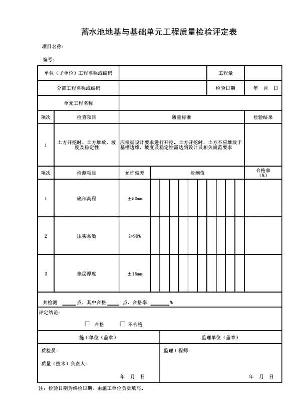 表格名称:蓄水池地基与基础单元工程质量检验评定表