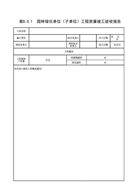 表格名称:表D.0.1 园林绿化单位(子单位)工程质量竣工验收报告