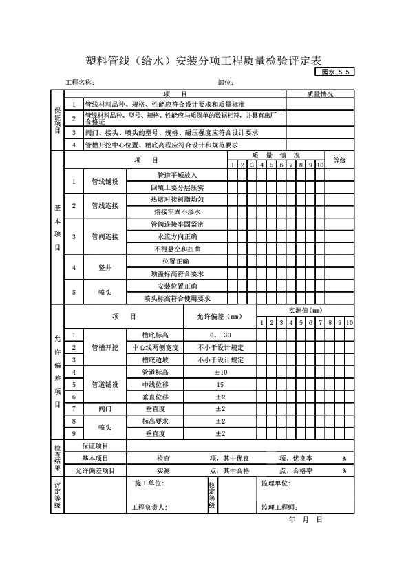 表格名称:塑料管线(给水)安装分项工程质量检验评定表