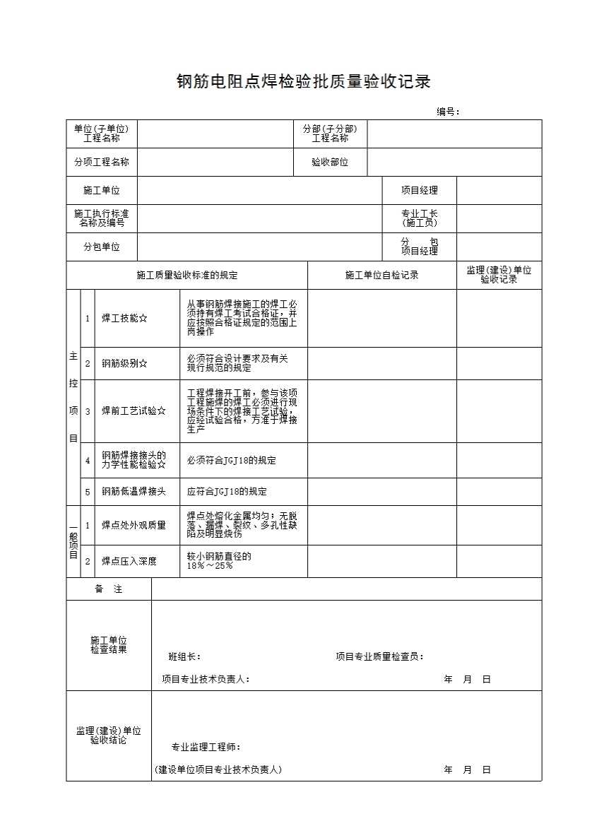 表格名称:C.5 钢筋电阻点焊检验批质量验收记录