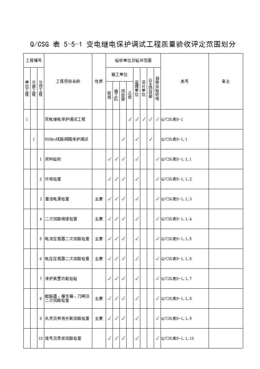 QCSG 表 5-5-1 变电继电保护调试工程质量验收评定范围划分