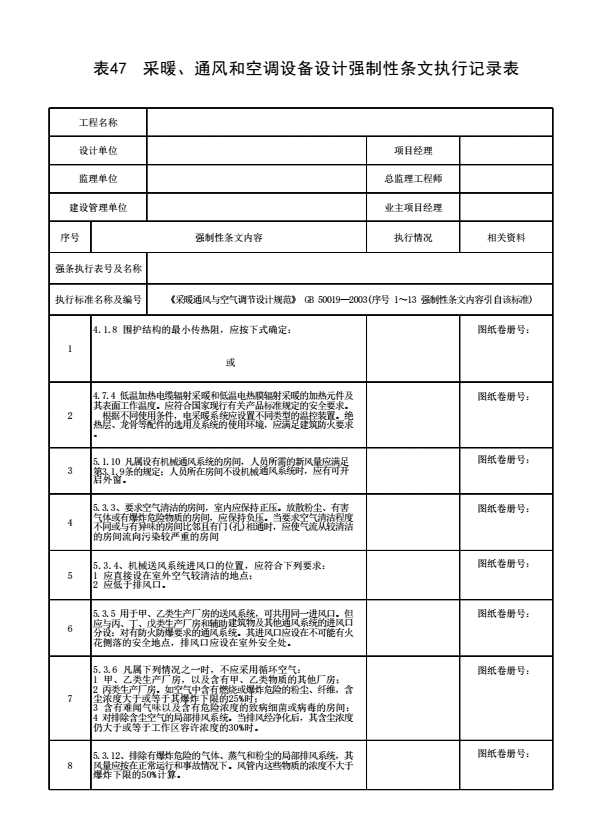 表格名称:表47 采暖、通风和空调设备设计强制性条文执行记录表