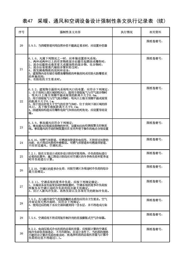 表47 采暖、通风和空调设备设计强制性条文执行记录表