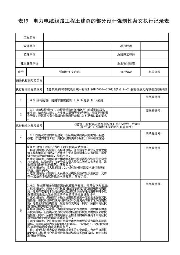 表格名称:表19 电力电缆线路工程土建总的部分设计强制性条文执行记录表