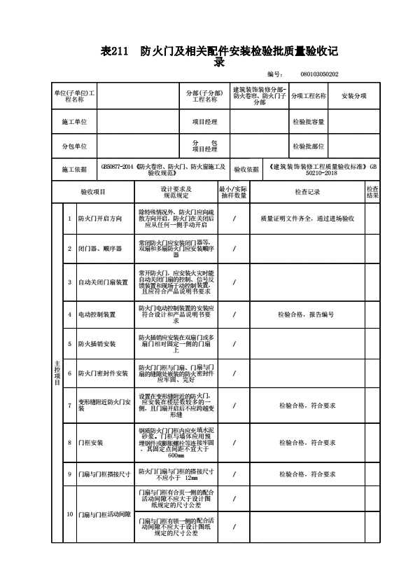 表格名称:080103050202 防火门及相关配件安装检验批质量验收记录
