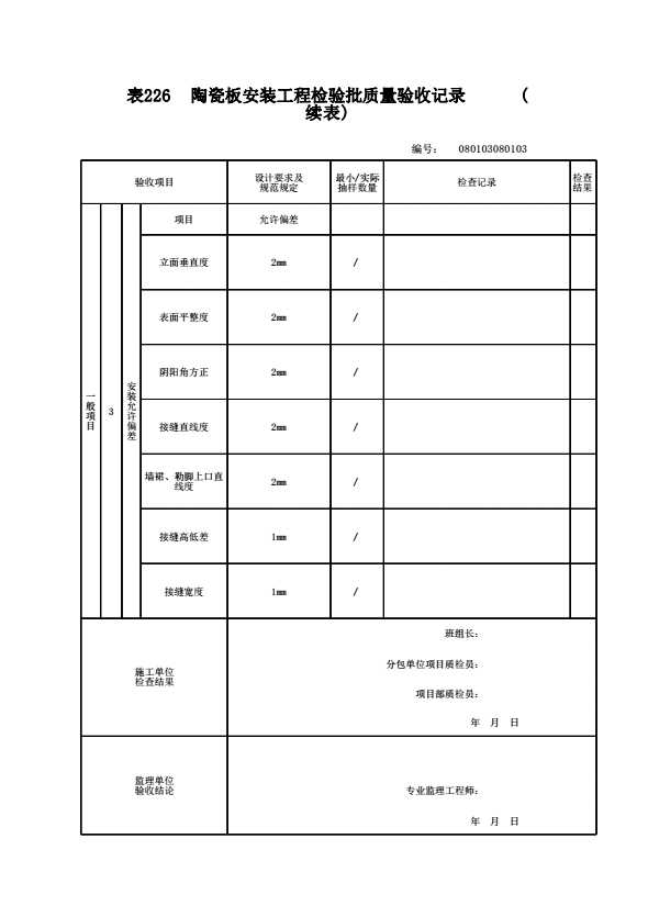 表格名称:080103080103 陶瓷板安装工程检验批质量验收记录