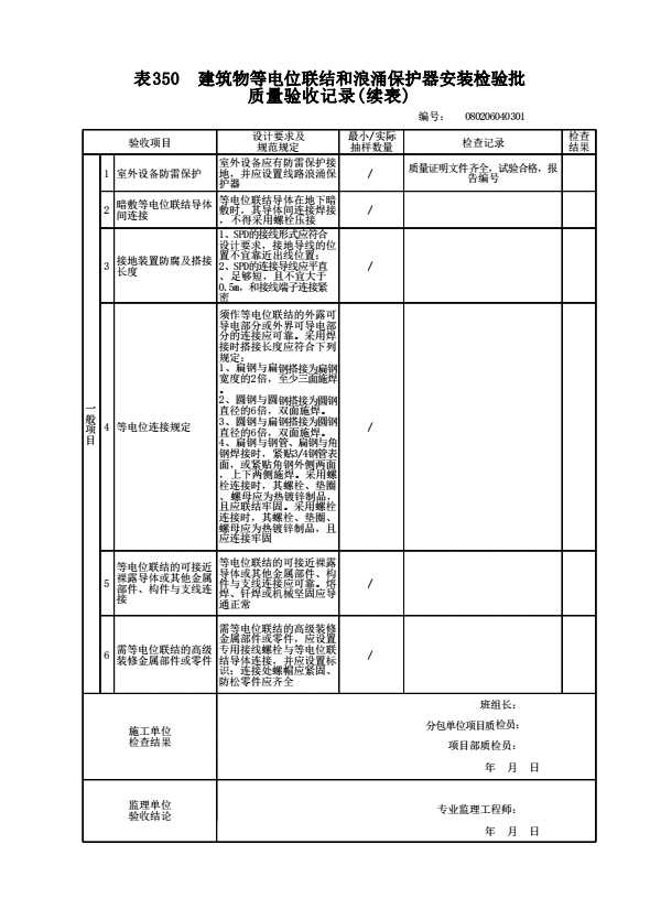 表格名称:080206040301 建筑物等电位联结和浪涌保护器安装检验批质量验收记录