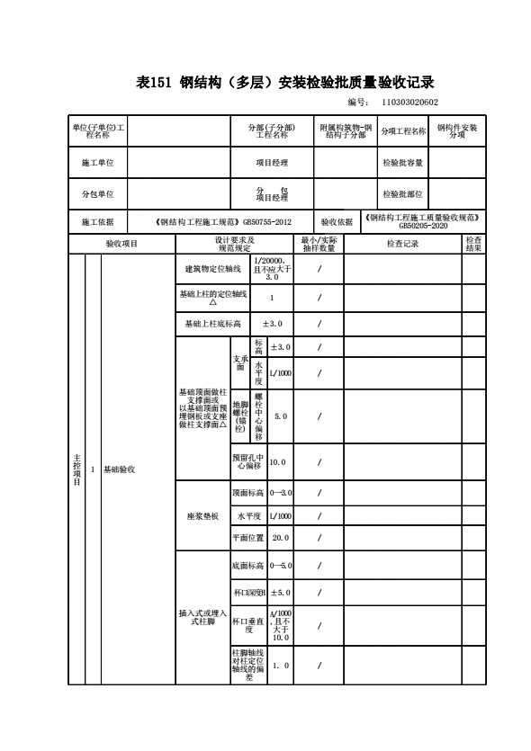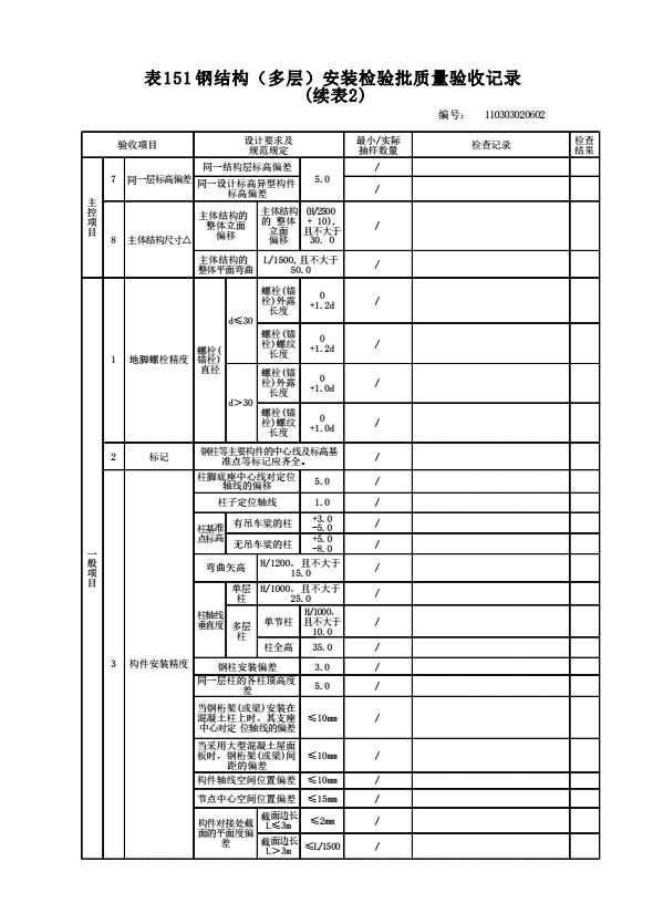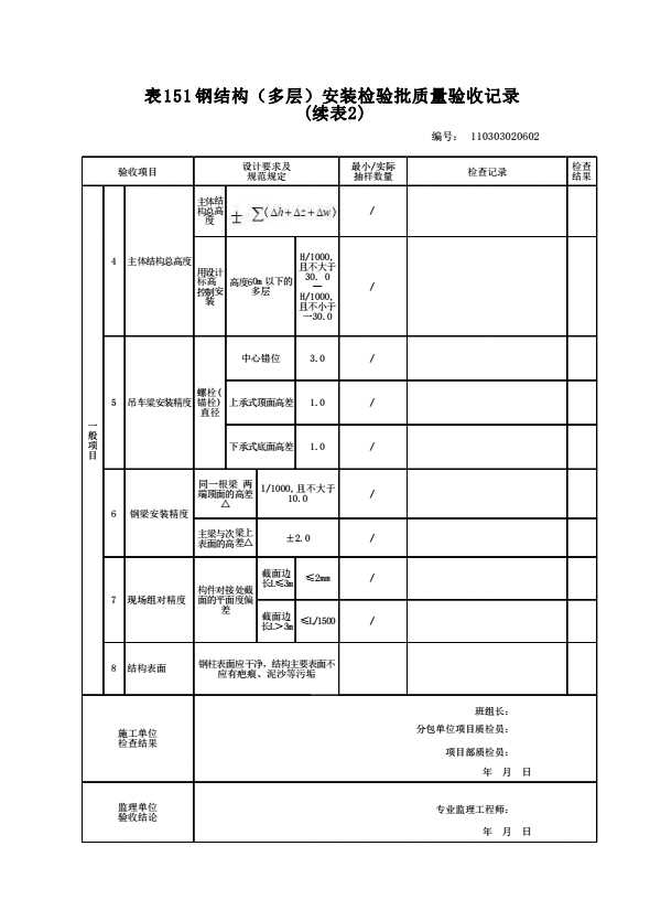 表格名称:110303020602 钢结构(多层)安装检验批质量验收记录
