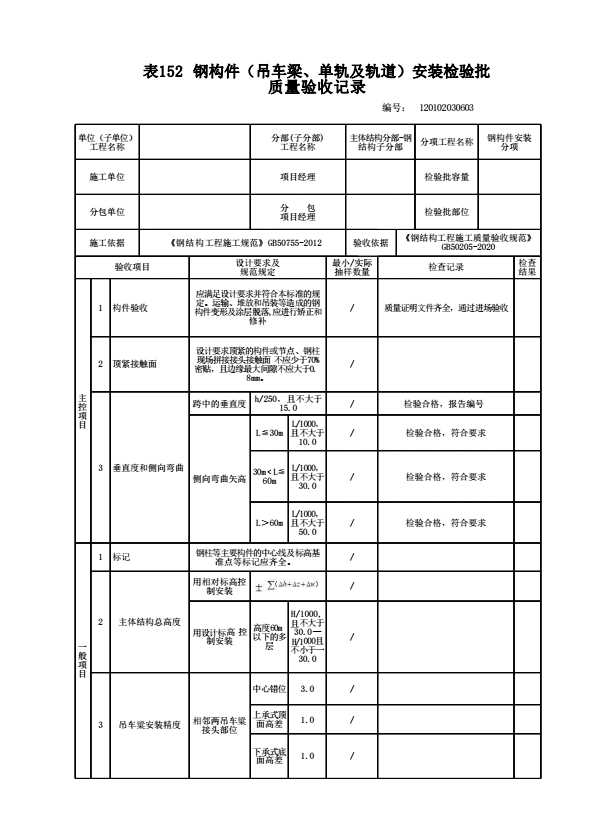 表格名称:120102030603 钢构件(吊车梁、单轨及轨道)安装检验批质量验收记录