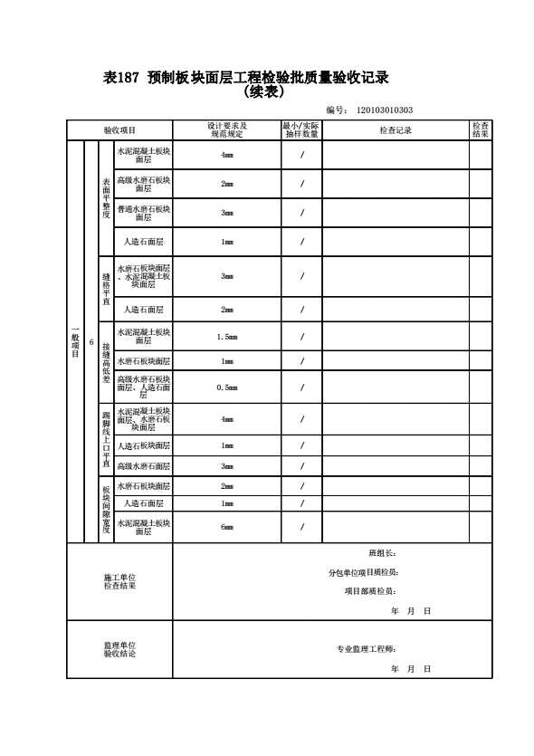 表格名称:120103010303 预制板块面层工程检验批质量验收记录