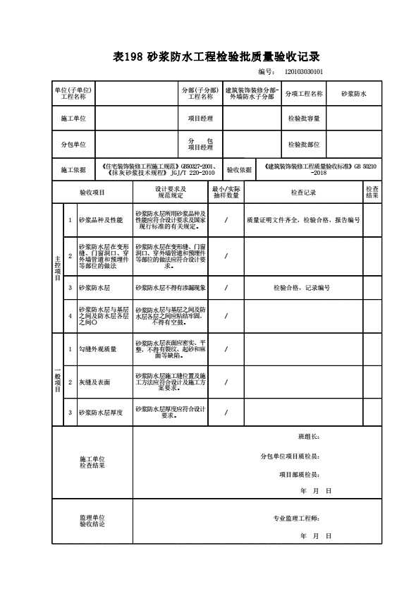 表格名称:120103030101 砂浆防水工程检验批质量验收记录