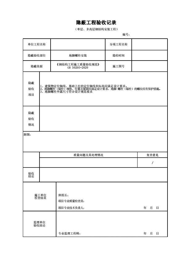 表格名称:隐蔽工程验收记录(单层、多高层钢结构安装工程)