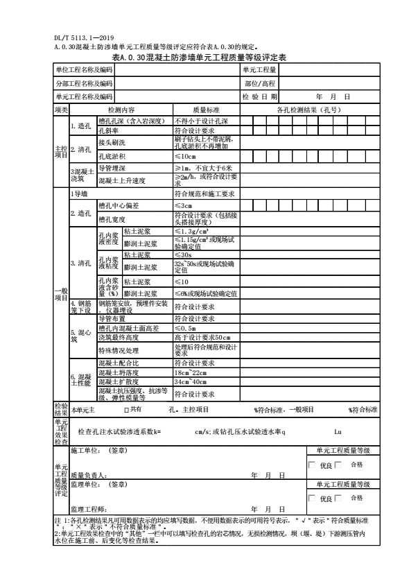 表格名称:表A.0.30 混凝土防渗墙单元工程质量等级评定表