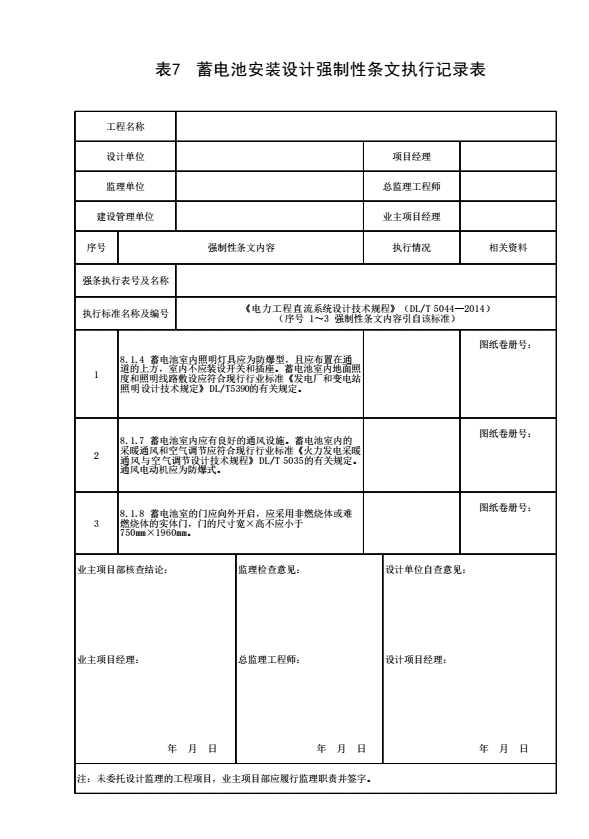 表格名称:表7 蓄电池安装设计强制性条文执行记录表
