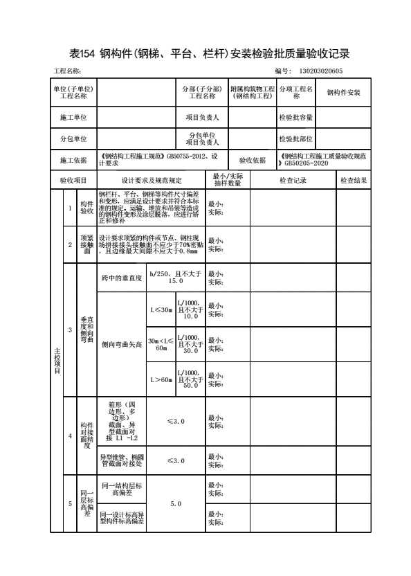 表格名称:130203020605 钢构件(钢梯、平台、栏杆)安装检验批质量验收记录